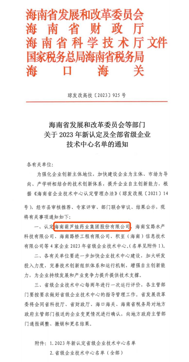 近日,海南省发改委等多部门联合公布了《关于2023年新认定及全部省级企业技术中心名单的通知》,其中,海南3044永利药业集团股份有限公司成功通过评审,被认定为省级企业技术中心,是本次获批的4家企业之一。